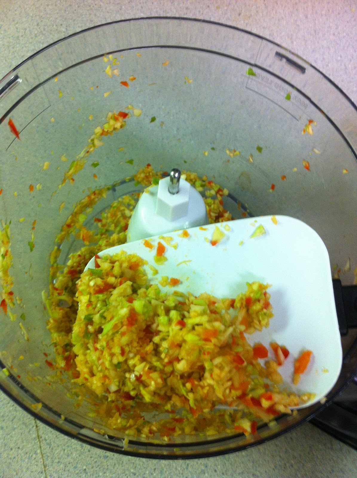 Chop 1/2 head of cabbage & 1/2 of a red pepper (or throw it into the food processor like I did- this makes it finely chopped and perfect for little ones to eat too.) Splash of rice vinegar & sesame oil then mix it up and top with sesame seeds (optional).